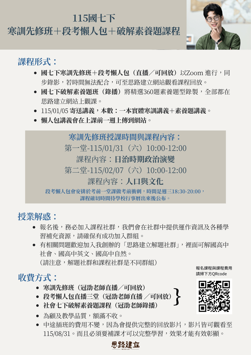 | 課程 | 國七先修班 | 國七下段考懶人包 | 國七下破解素養題課程 |