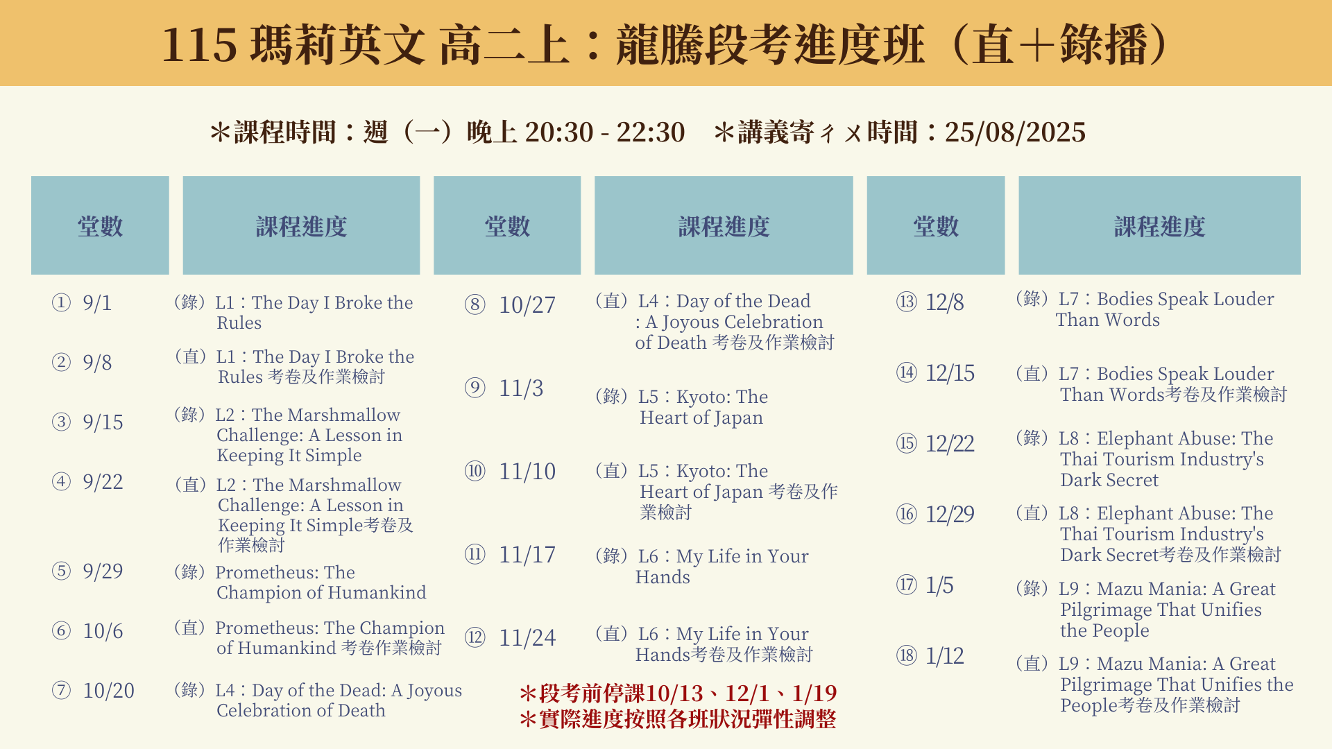 為了方便各校不同的進度(跳課、自讀等等),課文講解採『錄播』方式,方便學生可自行選取學校上課的單元,先行進行學習。