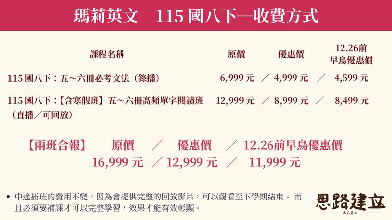🔥🔥🔥 國八下:英文課程兩班合報|會員方案 🔥🔥🔥