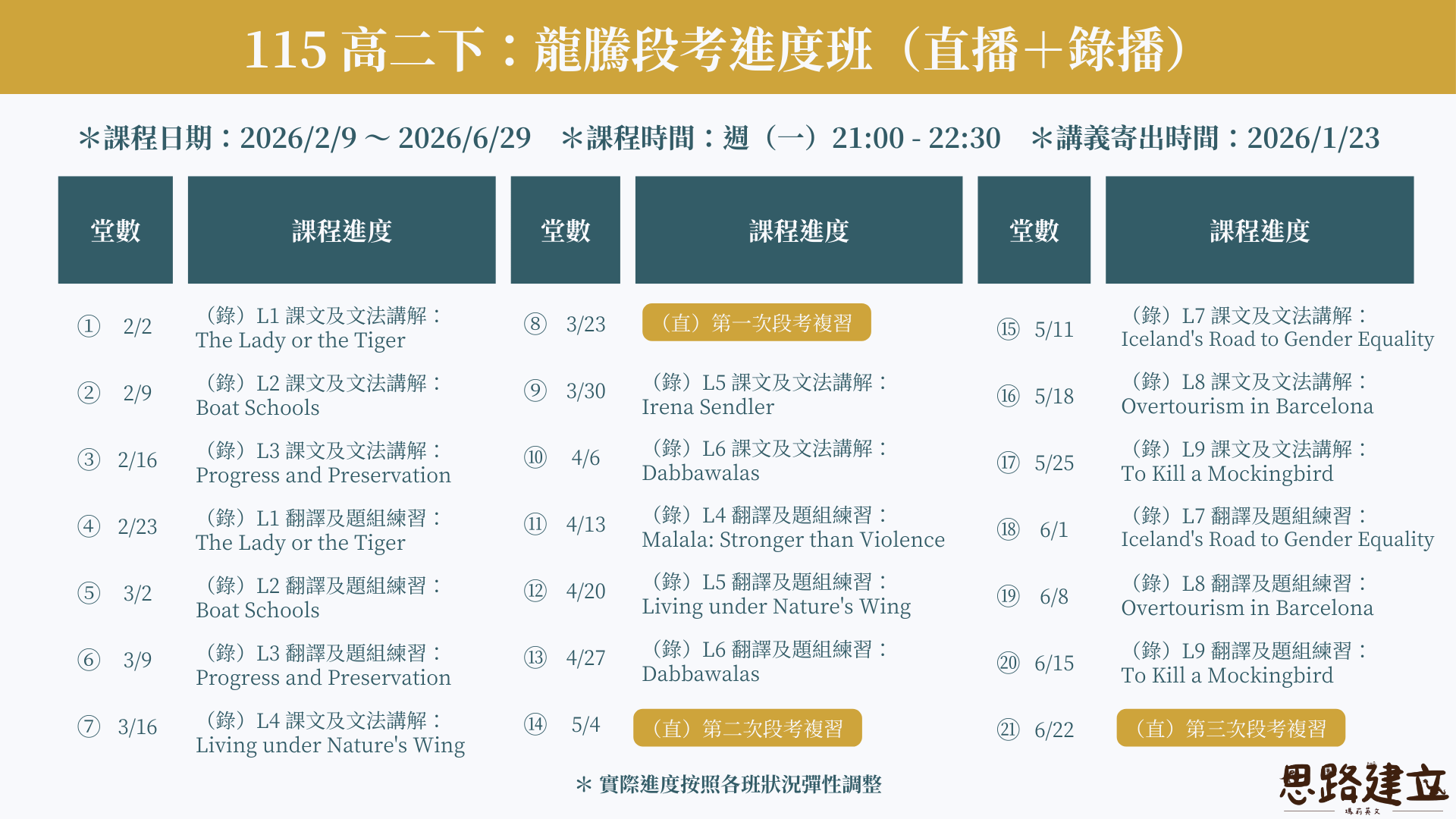 為了方便各校不同的進度(跳課、自讀等等),講解採『錄播』方式,方便學生自行選取學校上課的單元,先行學習。