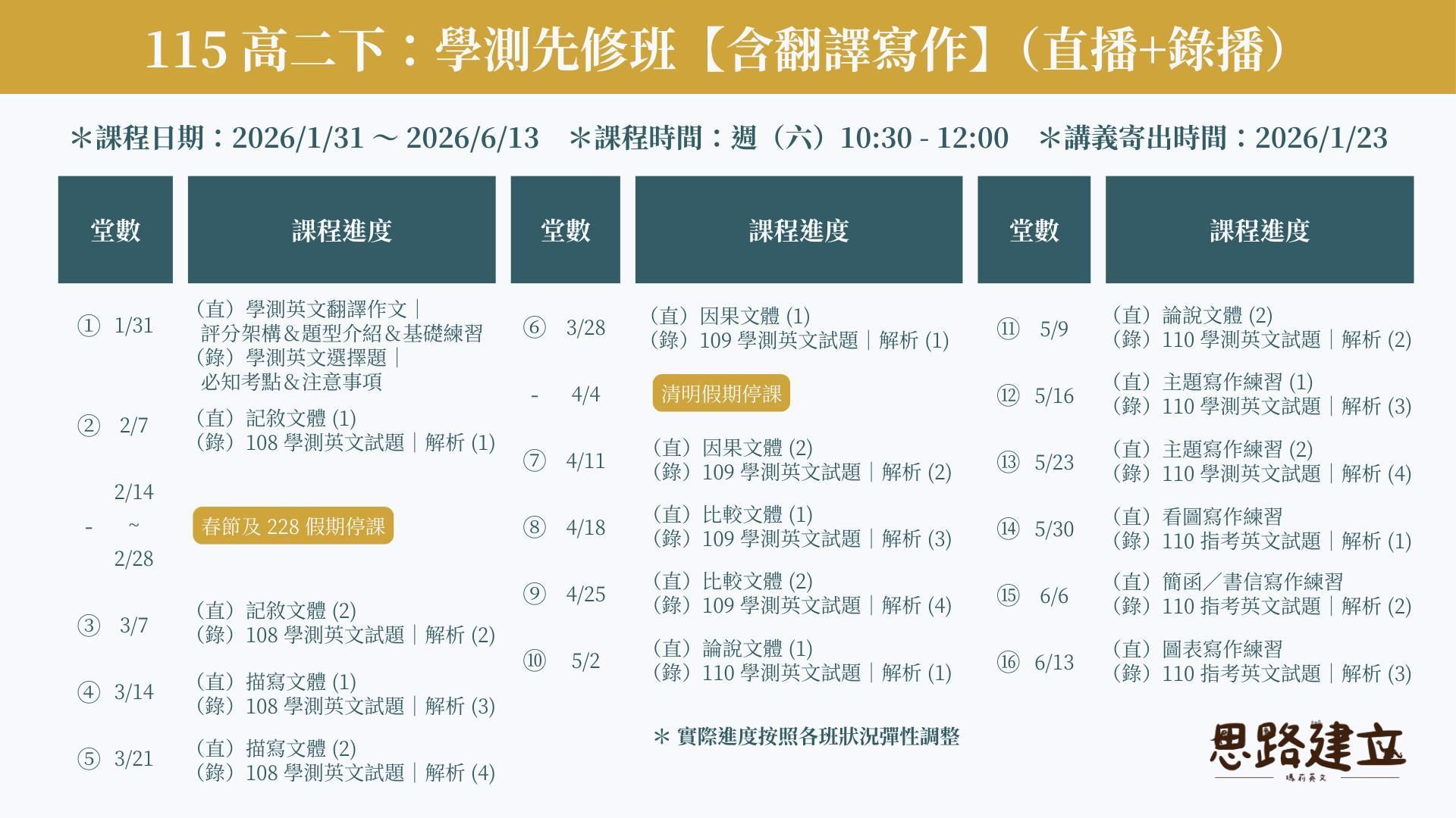 (2)高二下:英文學測先修班【含翻譯寫作】(直+錄播)$9,999