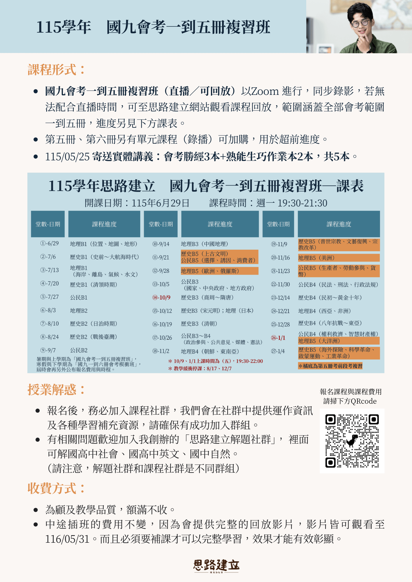 本課程不包含第六冊課程,而第五冊、第六冊的課程,因為與會考時間距離較接近,通常也是學生複習比較少次的部分,所以冠劭還是有錄製單元課程,跟直播(回放)統整方向不同,社會科準備上比較吃力的孩子,可以選擇弱科另外加報,在參加會考複習課程之前,先把錄播課程學過一次,加深印象,建立思路!